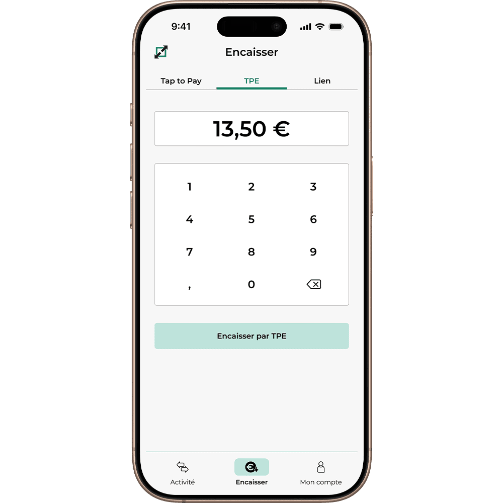 Notre TPE mobile (PAX D177), couplé à votre smartphone ou tablette iOS ou Androïd, vous permet d’encaisser vos clients où vous voulez et quand vous voulez. Il suffit de disposer d’un accès Internet (mobile ou Wi-Fi).